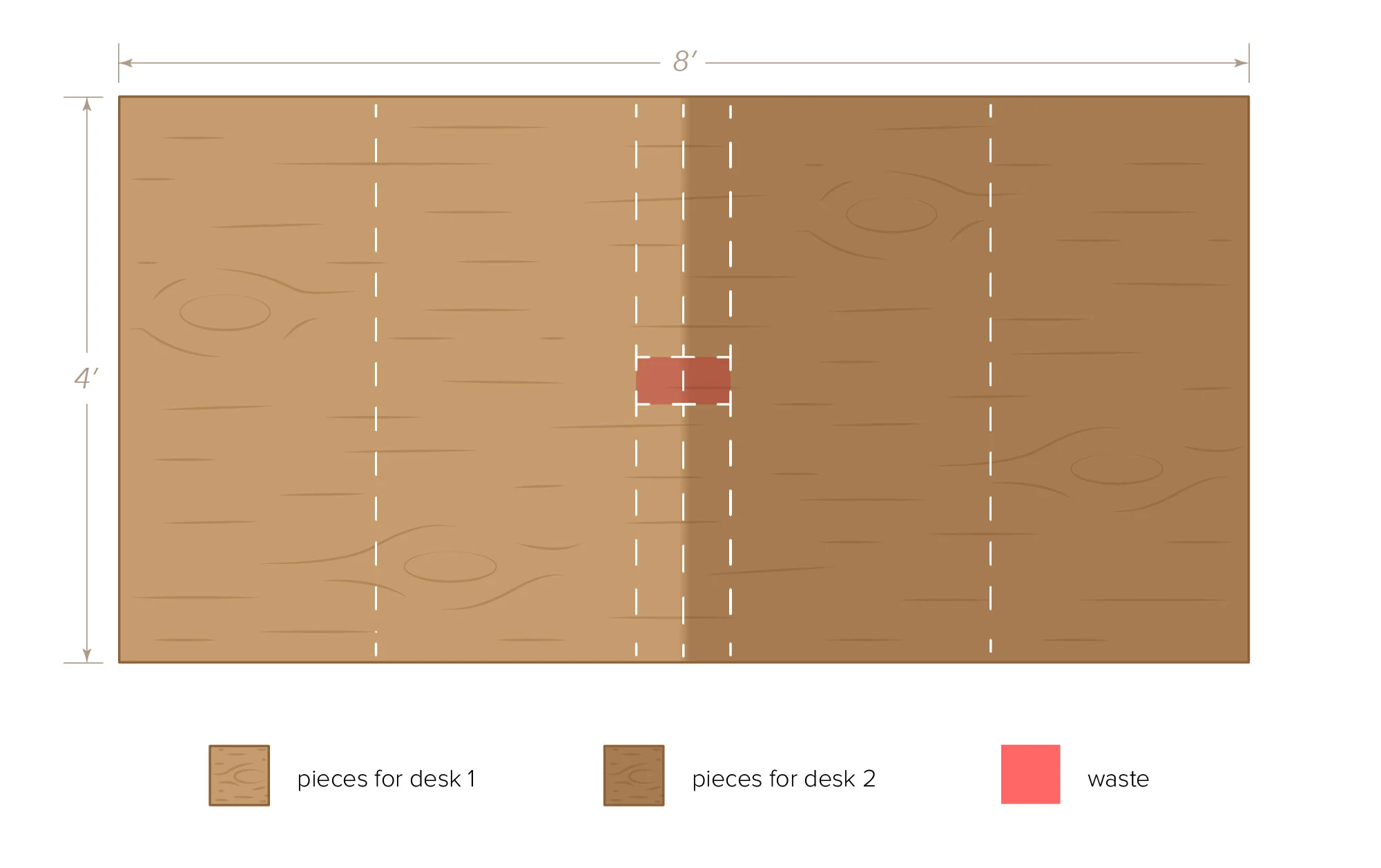My design had to be optimized for mass production in order to be competitive in the economy desk market. The minimal design made this optimization quite easy. Because the desk was just constructed from a uniform sheet of plywood, the key to optimization was minimizing the number of cuts and creating as little waste as possible. Through strategic planning two full desks are cut from one sheet of plywood with very little waste. Manufacturing costs are further reduced by painting the plywood edges white instead of applying edge banding.